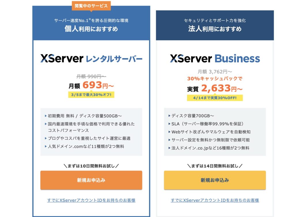個人ブログであれば、左側の「月額693円〜」でOK。