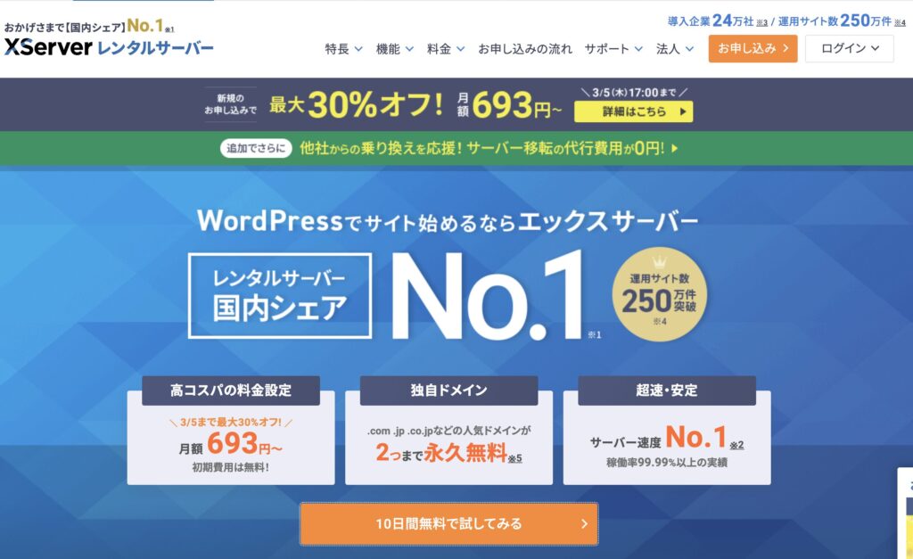 - ドメイン(住所): ネット上のURL(〇〇.comなど)。エックスサーバーなら、通常は年間数千円かかるドメインが最大2件まで永久無料になる特典があり、コストを大幅に抑えられます。