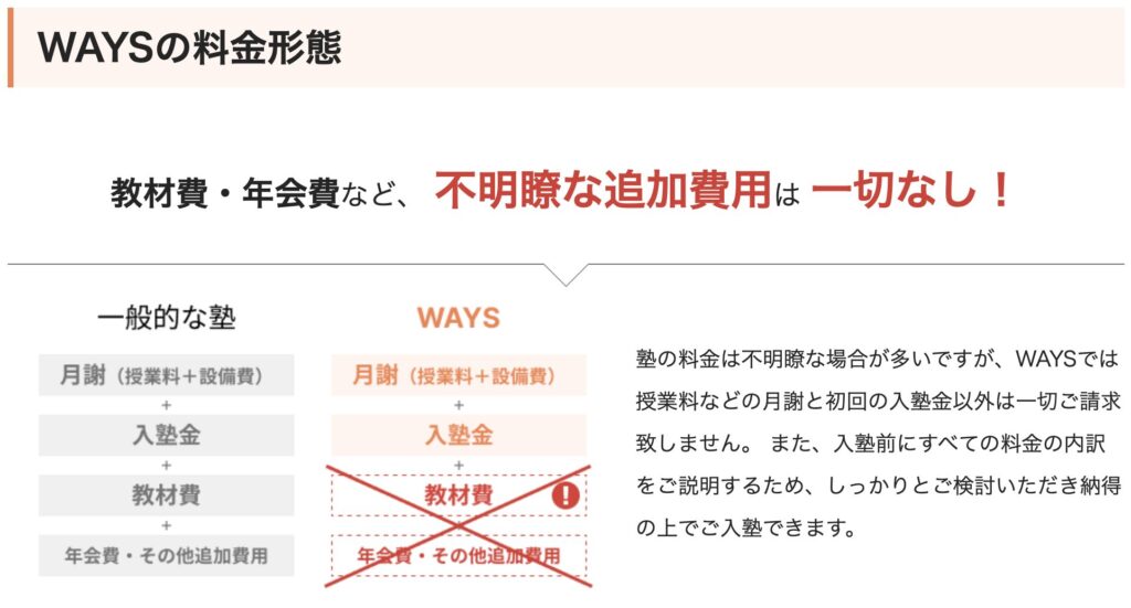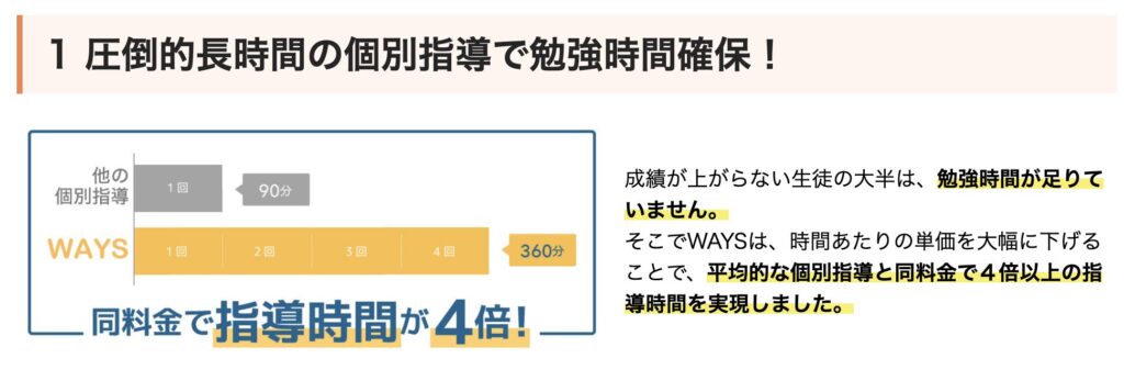 WAYSは、一般的な個別指導塾と同等の授業料で、より長い指導時間(1コマ120分)を提供することを目指しています。これが「実質4倍の指導時間」や「個別指導にしては安い」と評価される理由です。